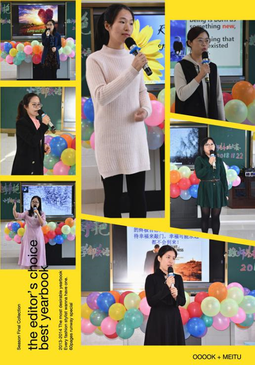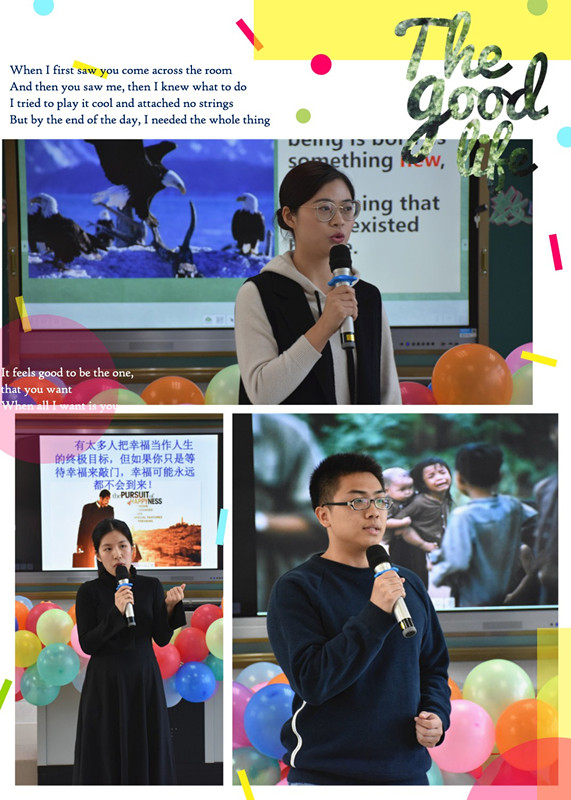 其中,蒋宇君老师朗诵了作品“Born to win”、刘建文老师朗诵了“Blowing in the Wind”、温慧莹老师朗诵作品“There is no way to happiness,Happiness is the way ”纯正的语音,声情并茂的演讲,引入大家对人生的思考之中。