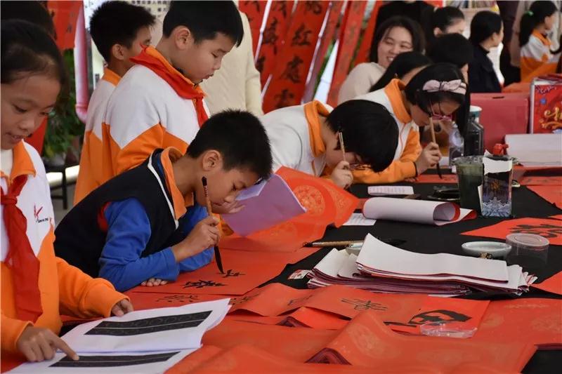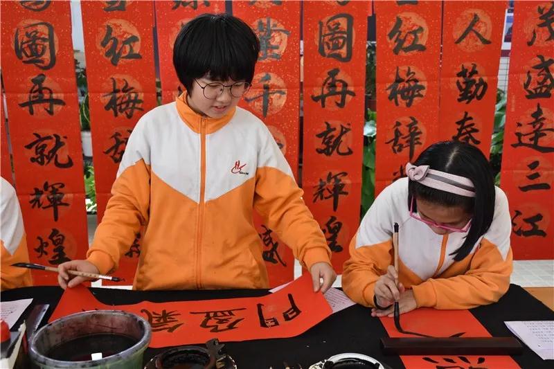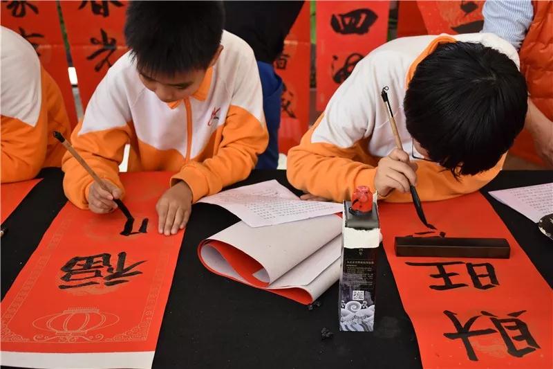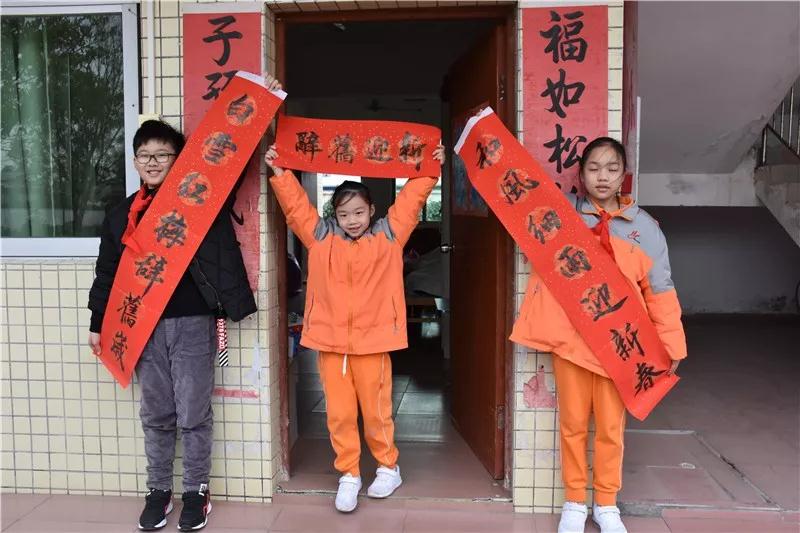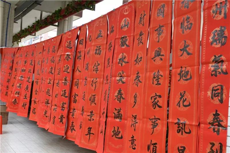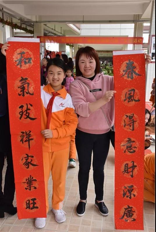 同学和家长们手捧着一幅幅墨迹未干的春联笑逐颜开。