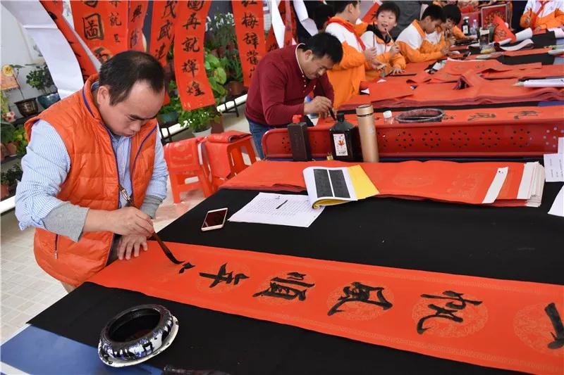 现场人头攒动,一副副苍劲有力、喜庆吉祥的春联铺满了桌面、地面,挂在空中,迎风飞舞,喜气洋洋。