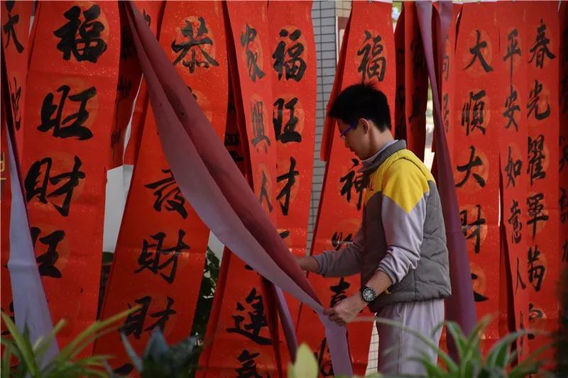 义卖春联的同学们一字排开,即席挥毫,现场春联义卖送美好祝愿。