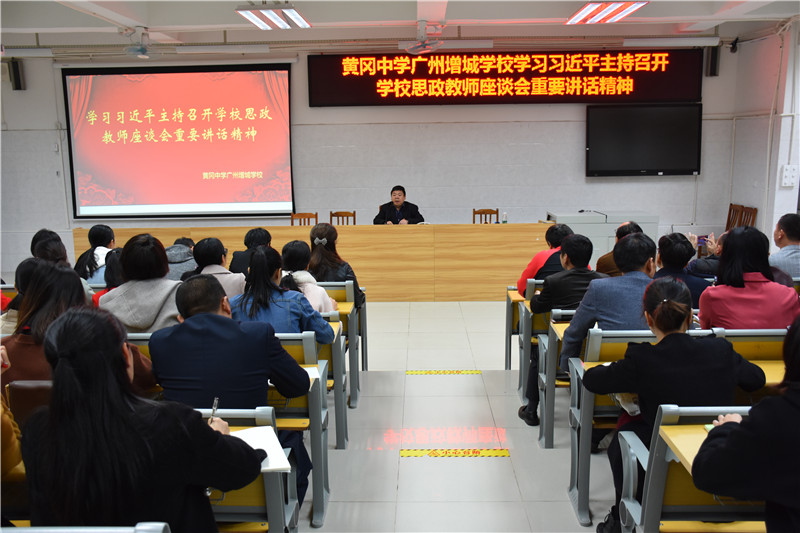 近日,黄冈中学广州增城学校(简称黄广增城学校)全体教师在阶梯会议室召开学习贯彻“习近平总书记在学校思想政治理论课教师座谈会上的重要讲话”的会议。