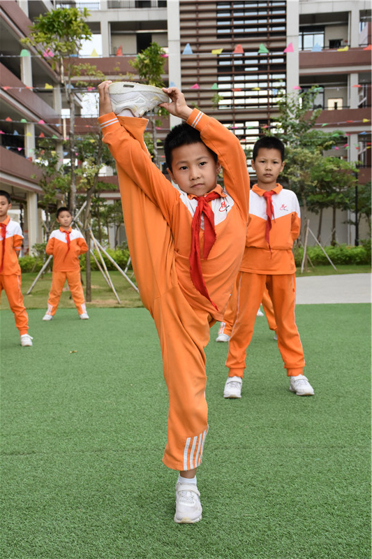 鲤鱼打挺、大鹏展翅……黄广学子们动作标准、拳法漂亮,忽而似鹰击长空,刚劲有力,忽而又如行云流水,绵绵不断,一张一弛,一招一式,将中华武术的精髓演绎得淋漓尽致。