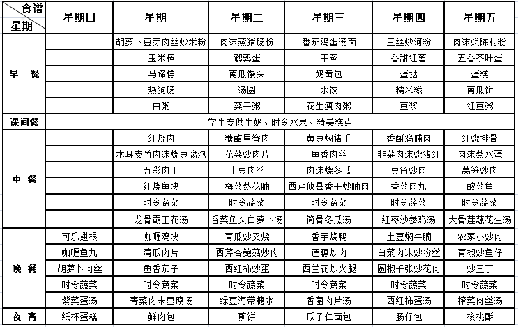 我校每周“营养菜谱”经过学校营养师审核通过,一日五餐(早、中、晚餐及课间餐、宵夜),确保膳食案例、营养、均衡、充足,满足孩子健康成长需要,敬请家长关注。