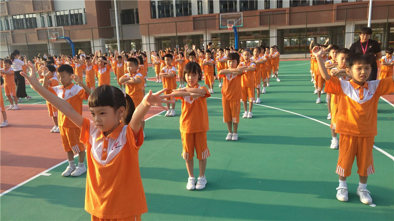 瞧,一年级的萌娃们也不甘示弱,尽管还是一张张稚嫩的笑脸,尽管是初学韵律操,但是孩子们凝神屏气,却多么专注……