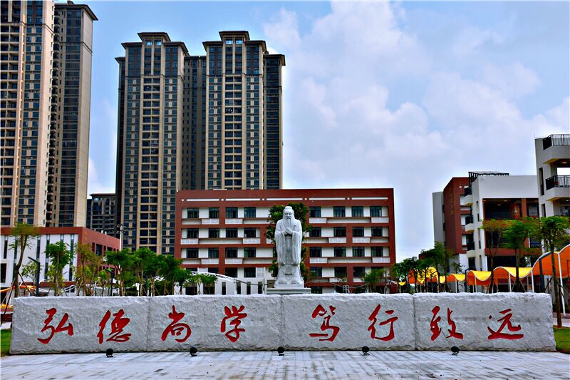 走近校园正大门,,迎面而来的是一长条巨石,上面镌刻着黄冈的校训————弘德尚学 笃行致远。不远处的广场中央,伫立着一尊高8米,重达近50吨伟岸的孔子圣像。