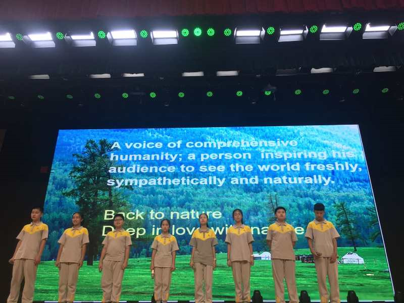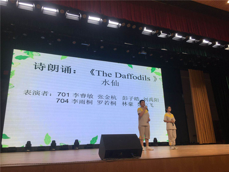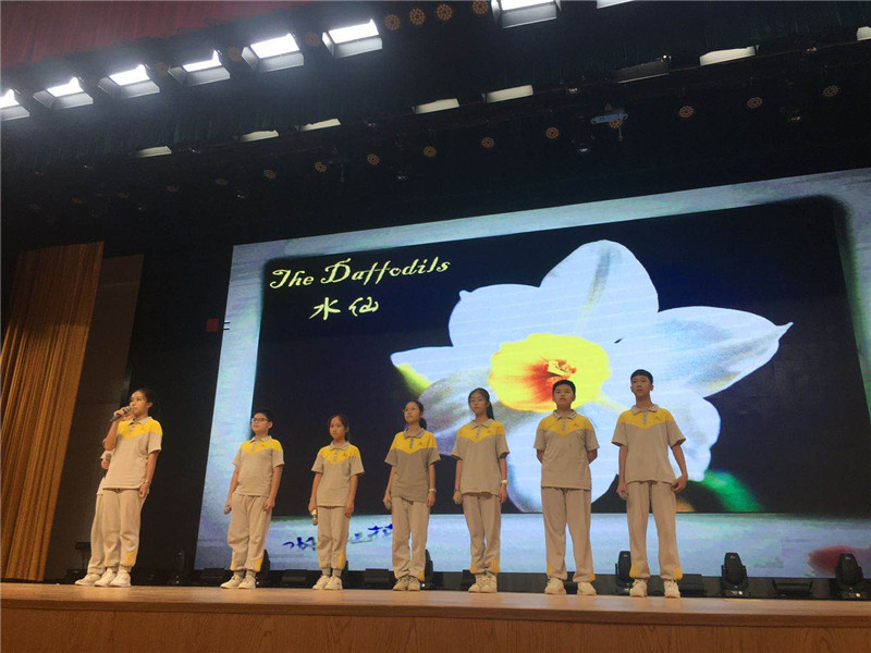 最后,英语诗歌朗诵《The Daffodils 》闪亮登场,八个学生以优美动听的英文朗读给我们带来了视听的享受,美仑美奂的背景音乐让大家陶醉其中。