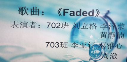 刺激的英语抢答过后,702班和703班的六个英语歌唱小能手还给我们带来了悦耳的歌曲《Faded》。标准的英文发音以及动听的音色让我们如沐春风。