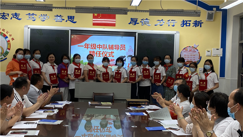 老师们分别被授予中队旗和颁发聘书。
