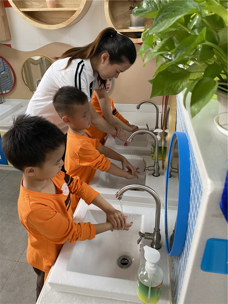 幼儿在饭前、便后、活动后均要求用流动水及洗手液洗手。严格采用“六步洗手法”,培养孩子良好的个人卫生习惯。