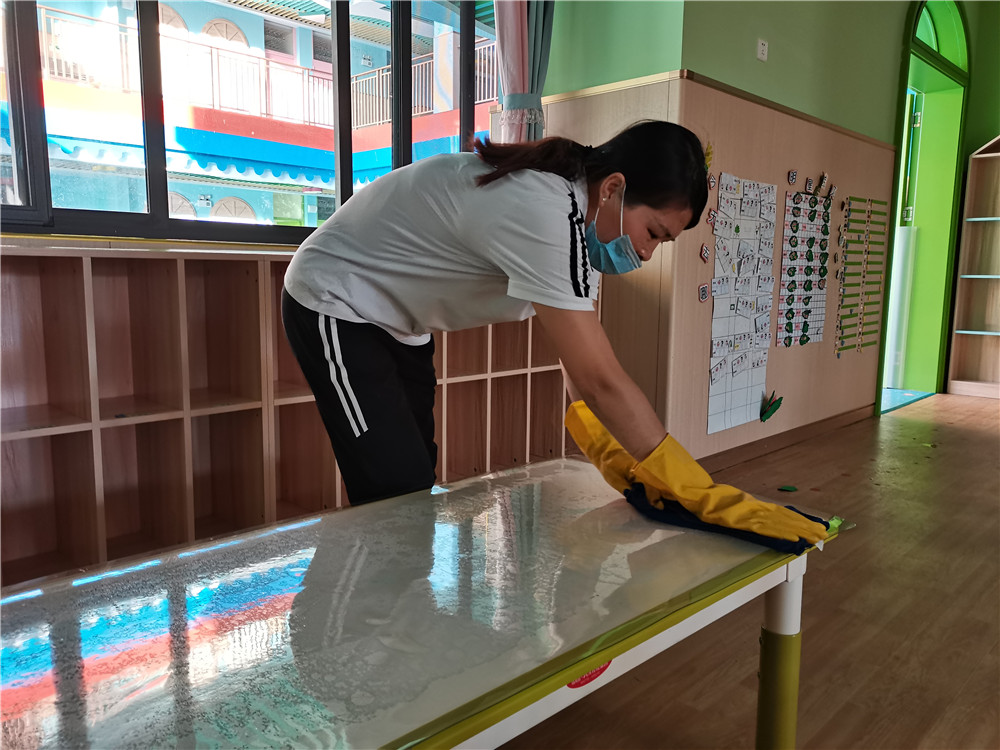 桌面消毒、室内整理、扫地拖地、洗手间清洁是班级老师每天的工作重点。