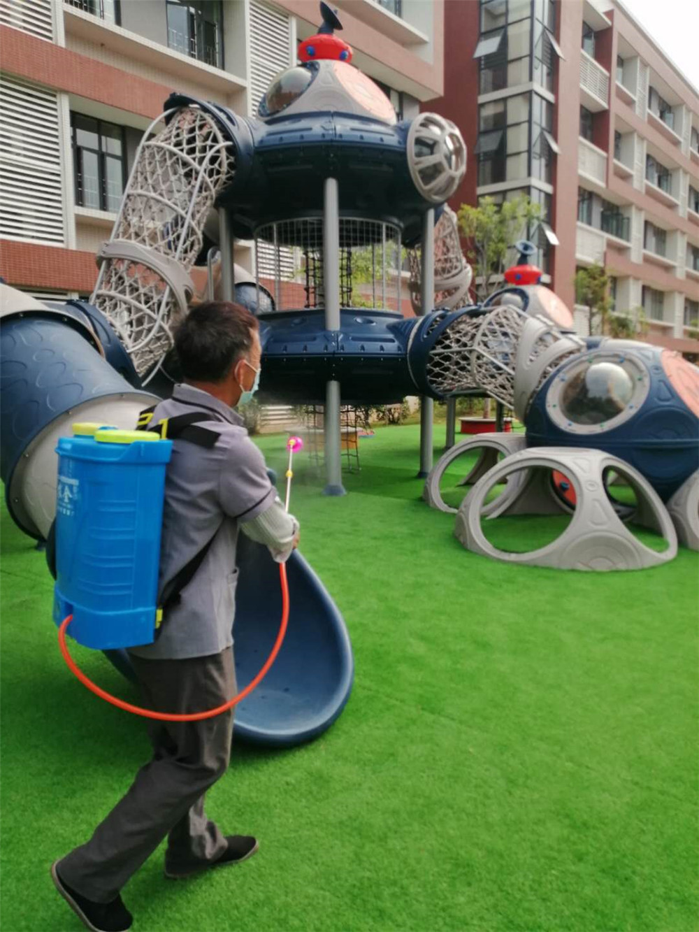 幼儿园大型玩具、公共活动区域定期用稀释后的消毒水擦拭,用清水冲洗干净,用清洁布擦干,草皮也会请专业人员定期消毒。