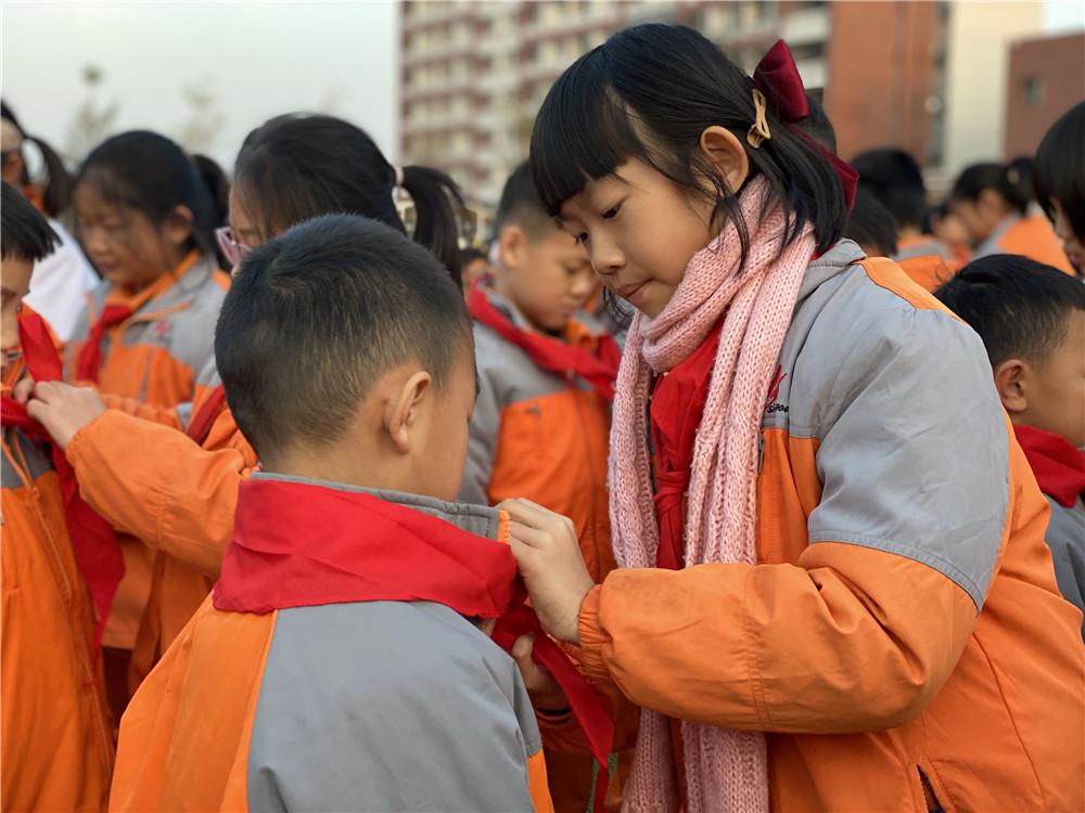 随着《红领巾飘起来》音乐响起,高年级的队员代表们认真地为新队员们佩戴上了鲜艳的红领巾。