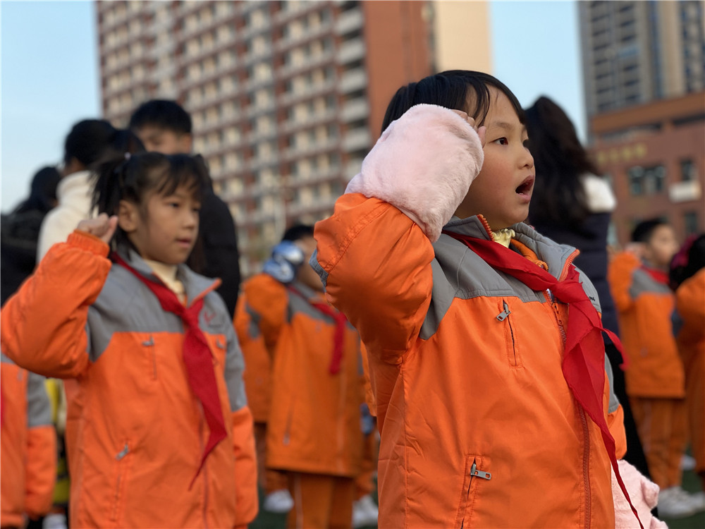 在少先队辅导员刘朵老师的带领下,少先队员们呼号:“时刻准备着”——