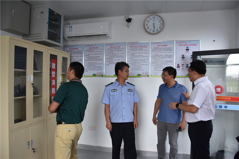 李书记一行在黄广增城学校执行董事薛来武、校长蒋晓明陪同下,察看了学校校园周边治安情况、消防安全设施情况,详细了解学校校门保安室安保相关工作的管理实施情况。