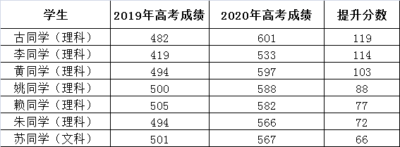 另外,2019届复读学生经黄广学校一年的学习指导,在2020年高考中也创出超越预期的显著提升,下图是部分案例。