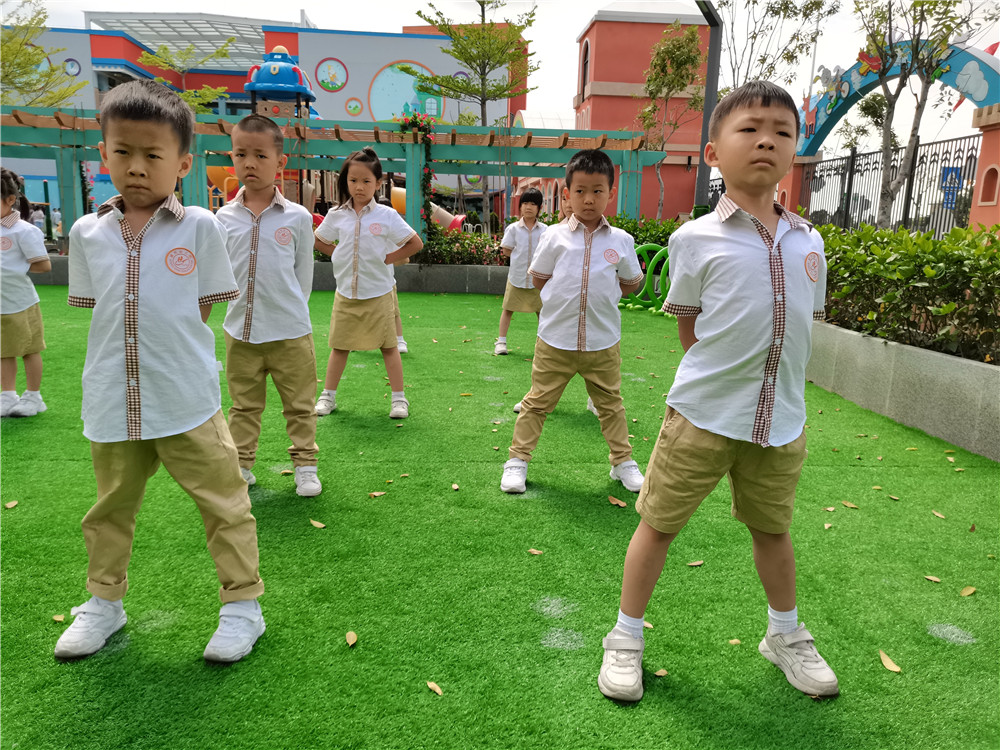 幼儿站姿抬头、挺胸、两眼向前平视,双手自然落于裤缝之间。